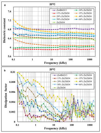 In Figure 7a,b, the frequency dependences of the dielectric constant and dissipation factor at 20 °C in the range of 100 Hz to 2 MHz are compared for pure Zn4B6O13, pure Zn2SiO4, and seven Zn4B6O13–Zn2SiO4 composites.