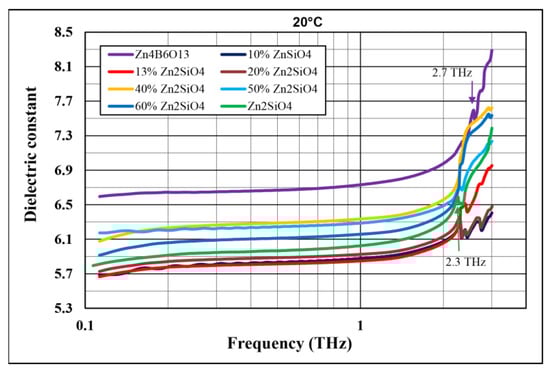 Figure 9 shows a comparison of the dielectric constant at room temperature in the 0.1–3 THz frequency range for pure Zn4B6O13, pure Zn2SiO4, and Zn4B6O13–Zn2SiO4 composites. The plots of the dielectric constant versus frequency have similar courses for all the materials investigated. In the frequency range of 0.1–1.5 THz, no peaks are present, and the frequency dependence is weak. The dielectric constants at 1 THz are slightly lower than those at 1 MHz. In general, such frequency dependences of the dielectric constant at very high frequencies are consistent with the theoretical predictions of the model of damped harmonic oscillators [40,41].