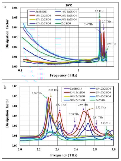 Comparison of dissipation factor at 20 °C as a function of frequency for Zn4B6O13, Zn2SiO4, and Zn4B6O13–Zn2SiO4 ceramics: (a) a log-lin plot in the range 0.12–3 THz and (b) a more detailed lin-lin plot, in the range 2–3 THz.