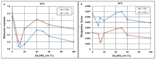 Dependence of dielectric constant (a) and dissipation factor (b) at 20 °C on the Zn2SiO4 content in Zn4B6O13–Zn2SiO4 composites for 1 MHz and 1 THz.