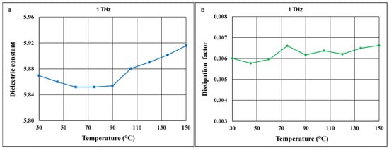 Since the temperature coefficient of thermal expansion is very low for both willemite and Zn4B6O13, the main contribution to the temperature coefficient of resonant frequency for the composites under investigation originates from the temperature coefficient of dielectric permittivity. Figure 12 shows the effect of temperature on the dielectric constant and the dielectric loss in the terahertz range for 87% Zn4B6O13–13% Zn2SiO4 ceramic. The course of the frequency dependences is the same for different temperatures in the tested range of 30–150 °C. As illustrated in Figure 13a,b, for frequencies corresponding to stable characteristics, the dielectric constant and the dissipation factor values generally slightly increase with temperature. These changes are small, less than 10% in the temperature range of 30–150 °C for the dielectric constant. The temperature coefficient of dielectric permittivity in the 30–90 °C temperature range is relatively low, at a level of −44 ppm/°C for 87% Zn4B6O13–13% Zn2SiO4 ceramic.