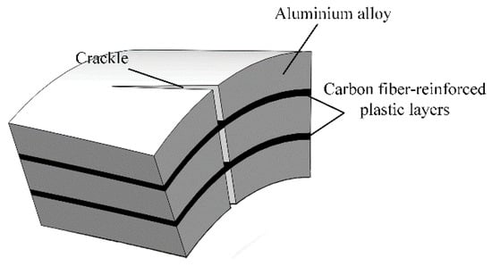 Lightweight FMLs have received widespread attention due to the shortcomings of common aluminium alloys. In some cases, for example, anti-fatigue cracks cannot withstand high pressure. With the deepening of research in recent years, a series of FMLs with better performance had been developed [5,10,11]. These materials have excellent mechanical and physical properties [5,12,13,14]. Among them, Carbon Fibre-Reinforced Aluminium Laminates (CARALL), such as aramid-reinforced aluminium laminates and glass-reinforced aluminium laminates, are better than other Al-based FMLs in terms of strength, stiffness and fatigue performance [15]. Carbon fibre (CF) has higher modulus and residual and impact strength and lower specific strength than aramid fibre and glass fibre. Moreover, compared with aramid and glass fibres, CF can provide a more effective crack bridging to Al layers, thereby effectively reducing crack occurrence [16,17]. The crack bridging mechanism of FMLs is shown in Figure 1 [18]. However, the adhesion between aluminium alloy and the CF layer is relatively weak and needs improvement [19].