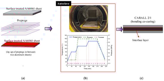 Three categories of CARALL with pattern of 2/1 FMLs, namely, two AA6061 sheets and one CFRP ply, were prepared and their laminating designs were shown in Figure 2a. The curing process was conducted in an autoclave (Meizhoubao special equipment Co., Ltd., Taizhou, China) with optimised parameters, as shown in Figure 2b. Primarily, the temperature of the autoclave was increased to 80 °C with a heating rate of 2 °C/min and held for 30 min to ensure that the thermosetting resin contributed to adequate fluidity and air removal. Then, the temperature was increased to 115 °C with the same heating rate and kept for 60 min to cure the epoxy resin at the interface first. Thereafter, the samples were further subjected to an increase in temperature (145 °C), which was maintained for 120 min to cure the epoxy resin. Finally, the specimens were cooled to 25 °C to obtain the cured CARALL, as shown in Figure 2c. The prepreg lay-up method and aluminium sheet thickness in each CARALL sample are shown in Table 4.