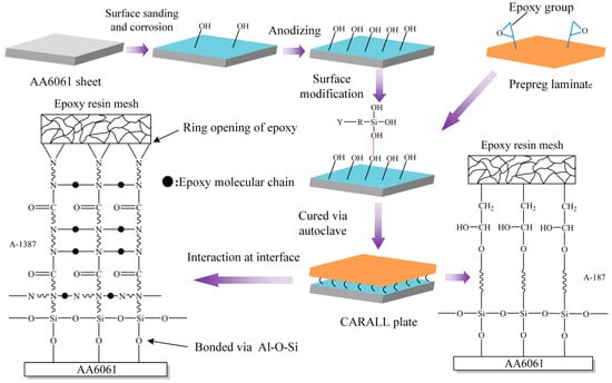 A flexible coupling agent layer was prepared on the anodized AA6061 sheet to improve the bonding durability of CARALL. The mechanism underlying the enhancing effect of A-187 and A-1387 on the interfacial strength is shown in Figure 4. The inorganic functional groups of the two silane coupling agents were trialkoxysilyl groups, namely, Si–(OCH3)3. The trialkoxysilyl group hydrolysed to silane alcohol and then condensed with hydroxyl groups on the surface of the AA6061 sheet to form a chemical bond, as shown in Figure 4. The organic functional groups were involved in the curing reaction of epoxy resin matrix. The epoxy group at the end of the molecular chain of A-1387 reacted with the molecular chain of amine curing agent in the resin system, which effectively connected the aluminium alloy with the resin and the network structure. The coupling agent molecules formed at the interface between the aluminium sheet and the resin, which effectively and evenly transferred the load and reduced the interfacial stress concentration. Therefore, the introduction of the molecular chain at the interface can effectively increase the bonding strength of the interface. The interfacial shear strength increased from (49.5 ± 1.3) MPa to (53.4 ± 1.0) MPa.
