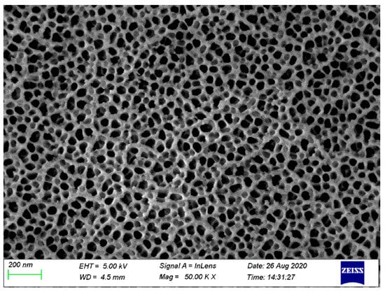 Figure 5 shows the SEM image of the surface of AA6061 after pretreatment. On the surface of the pretreated phosphoric acid anodic oxide film, the distribution of nanopores was very regular, and the pore size was uniform. Moreover, a certain surface dendritic structure was observed on the anodized film.