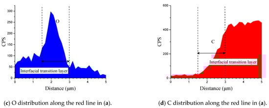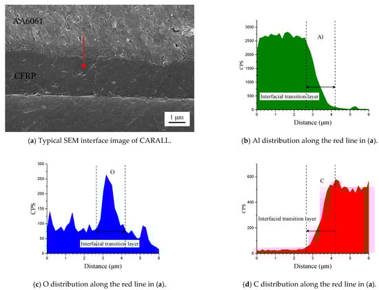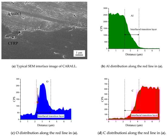 Figure 6 shows the cross-section of CARALL in processes PAA, 187 and 1387. No obvious gaps or other defects were observed under SEM. Specifically, no transition trace existed at the interface layer under 187 and 1387 processes, which indicated that an excellent wettability and adsorption effect was achieved. An interface layer with a thickness of approximately 2 μm was formed at the bonding interface of aluminium alloy and CFRP, and this interface layer was tightly combined, as shown in Figure 7a and Figure 8a. A transition layer was produced at the interface between CFRP and AA6061 with decreasing concentrations of Al and C and with increasing contents of the O element, as shown in Figure 7b–d and Figure 8b–d. The surface modification pretreatment produced a specific flexible interface layer, which could relieve and release the internal stress caused by temperature during the curing process [37,38].