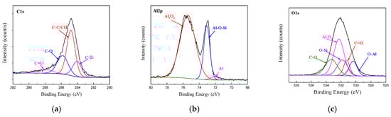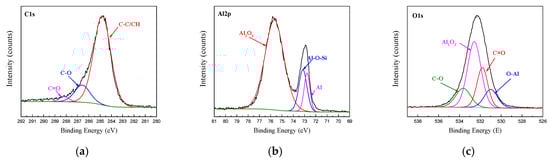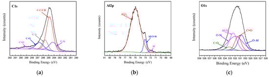 Fitting curves of XPS at the bonding interface of specimens 187: (a) C1s peaks, (b) Al2p peaks, (c) O1s peaks.