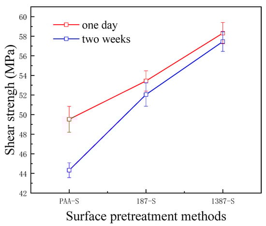 After two weeks, the percentage of interfacial shear strength decreased from 10.5% to 2.6%. In the same way, the end of the molecular chain of A-1387 also had a reactive primary amino group containing two active hydrogen atoms that can bond with the main epoxy resin molecular chain. Thus, the interfacial bond strength improved with the addition of the coupling agent. On the one hand, compared with the epoxy resin coupling agent, the amine coupling agent had more action points with the main network structure of the epoxy resin. On the other hand, ether bonds (–C–O–C–) were present in the organic molecular chain of the epoxy coupling agent, and the fracture energy was slightly lower than that of alkyl (–C–C–). The molecular chain strength at the interface layer was lower, which more easily led to fracture. Therefore, the interfacial shear strength of the system with amine coupling agent A-1387 was higher than that of A-187, which is (58.3 ± 1.1) MPa. After two weeks, the interfacial shear strength decreased only by 0.9%. The bonding strength without any treatment was only about 7 MPa [39]. In addition, Figure 12 shows that the primary amino group also existed in the molecular chain of A-1387; thus, it reacted with the epoxy molecular chain. Cross-linking between the molecular chains effectively increased the cohesive strength and modulus of the interface layer, which was beneficial to the interface load transfer and stress concentration reduction [40]. Therefore, the interfacial shear strength of the A-1387 system was relatively high.