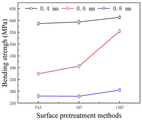 Figure 13 shows the effect of different surface pretreatment methods (PAA, 187 and 1387) on the bending strength of CARALL, where the thickness values of the AA6061 sheet were 0.4, 0.6 and 0.8 mm. The bending strength of CARALL after three surface pretreatments was consistent with the interfacial shear strength obtained by tension–shear test. With increasing interfacial bonding strength, the bending strength also increased, which further verified that the surface modification of amine coupling agent A-1387 had the greatest effect on the improvement of the interfacial bonding between AA6061 sheet and CFRP. In addition, the volume content of the AA6061 sheet in CARALL also affected the bending strength. The strength decreased with increasing AA6061 sheet volume content. The A-1387-modified CARALL exhibited excellent flexural properties in the bonding strength test, because the molecular chain of A-1387 was relatively long, which inhibited the formation rate of Griffith microcracks that reduced CFRP strength during CARALL‘s slow bending process. As shown in Figure 14, in the bending process, the cracks first appeared in the interface layer far away from the stress point, and then, the cracks initiated and propagated upward. Therefore, with an increasing number of CFRP layers, the energy required for crack propagation increased. Under the same thickness of the CARALL plate, the bending resistance increased with decreasing AA6061 sheet thickness, consistent with the results presented in Figure 13.