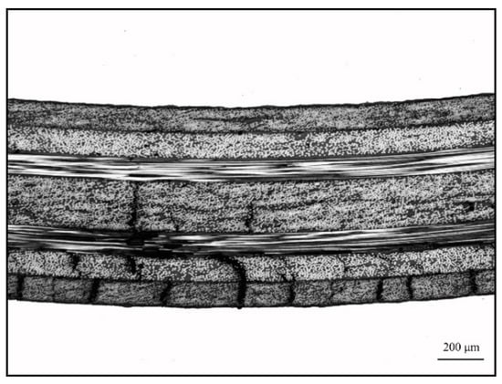 The bending strengths of CARALL were determined according to ASTM Standard D7264 [32]. The loading speed was 1 mm/min, and the support span-to-thickness ratio was 32:1. Four samples from each condition were tested, and the average values with standard deviations were given.
