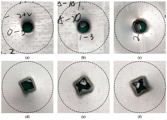 Typical deformation/failure modes of CARALL, ν = 3.42 m/s: (a,d) are the front and back of PAA-0.6, (b,e) are the front and back of 187-0.6, (c,f) are the front and back of 1387-0.6.