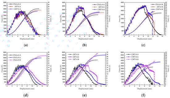 The displacement force curves and energy absorption of the nine types of CARALL are compared in Figure 16. When the volume contents of aluminium alloy were the same, and the strengths of interface differed, the initial loading processes of CARALL were nearly the same, as indicated in Figure 16a–c. After the initial loading stage, debonding occurred, and the integrity of CARALL was compromised. When the volume content of AA6061 was less than that of CFRP, the energy absorption decreased with increasing interface bonding strength, because the CFRP delamination and fibre shear fracture energy absorption dominated. The increase of interface bonding strength reduced the failure area of CARALL, thereby hindering the energy absorption of CARALL. When the volume content of AA6061 was larger than that of CFRP, the energy absorption of CARALL increased with increasing interface bonding strength. This finding was due to the fact that the plastic deformation energy absorption of AA6061 was dominant, and the increase of interface bonding strength increased the energy requirement of the plastic deformation of AA6061, thereby increasing CARALL’s energy absorption. Therefore, the C-0.8 sample showed the best specific energy absorption. Figure 16d–f show that when the aluminium alloy volume contents were different, and the interface bonding strengths were the same, the trend of the whole loading process of CARALL was basically the same. With increasing aluminium alloy volume content, the force-displacement curve moved backward, showing that the plastic deformation energy absorption gradually dominated.