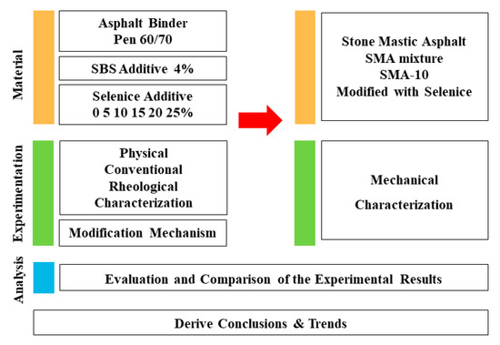 In this paper, the feasibility of using the refined Selenice natural bitumen as an asphalt binder additive in China is investigated. Firstly, the impact of the SNB additive is evaluated at the binder level and then, based on the results obtained, the mechanical behavior of an SNB modified stone mastic asphalt (SMA) mixture is explored. To achieve this goal, a comprehensive set of laboratory tests was performed. This includes the determination of physical properties of the material; the evaluation of the conventional and rheological behavior as well as the modification mechanism of a common paving asphalt binder having penetration grade of 60/70 (Pen 60/70) (JTG E20 T0604-2011) [32] with SNB additive at five different percentages; and the estimation of the mechanical response of an SMA-10 prepared with the addition of SNB and presenting a nominal maximum aggregate size (NMAS) of 10 mm. Figure 1 presents the research approach adopted in the present study.