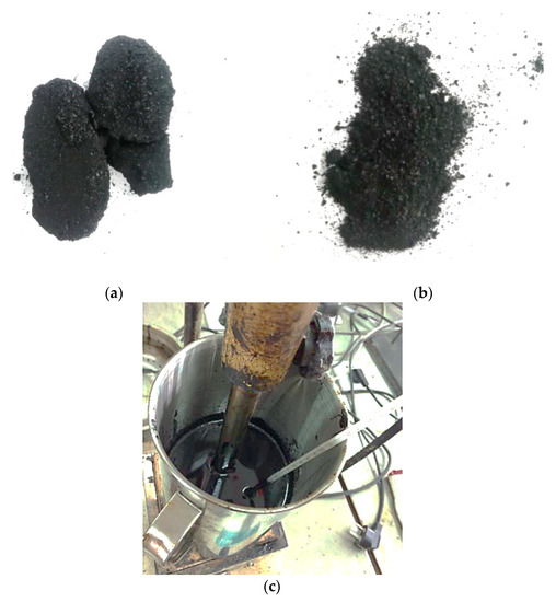 The blocks and agglomeration of SNB (Figure 2a) were first reduced to finer material (Figure 2b) through a grinding and crushing process. The size of finer SNB particles was roughly 1 mm (in the range of mesh 18) and the moisture content of SNB in its natural state was 2.46%. Then, the SNB in its natural state was preheated to remove the moisture in the binder blends to be prepared with the Pen 60/70 binder. Blending was initially performed with a glass rod for 15 min at a temperature of 165 °C, followed by the action of a high shear blending at 10,000 rpm for an additional 45 min (Figure 2c). SNB was added to the blend at different percentages: 0% (control), 5%, 10%, 15%, 20% and 25% by weight of SNB modified asphalt binder. Each batch of blend consisted of approximately 1.2 kg of SNB modified binder.
