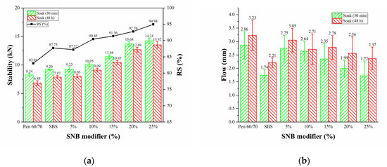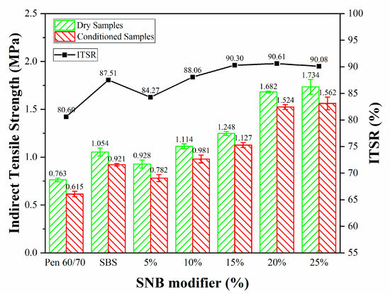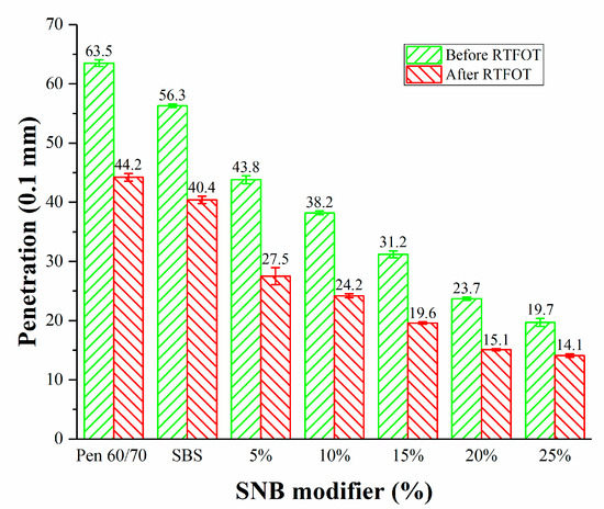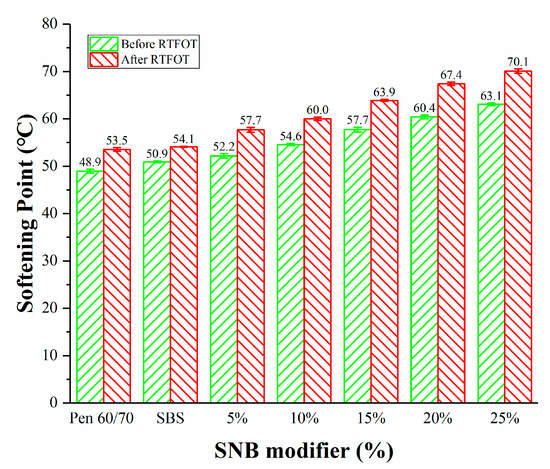 It can be seen from Figure 6 that the softening point difference (SPD) of base asphalt is the lowest, while that of SBS modified asphalt is the largest, which indicates that the storage stability of SBS modified asphalt is the worst, and a stabilizer needs to be added. The SPD of 5% and 10% is smaller and close to that of the base asphalt, which means that the smaller SNB content has less influence on the storage stability of asphalt. It can also be noted that the SPD and the difference of SPD of modified asphalt with SNB content more than 10% increases with the increase in SNB content, which indicates that higher SNB content is unfavorable to the storage stability of asphalt. According to the existing Chinese standard JTG F40-2004 [51], the softening point difference of modified asphalt should not be more than 2.5 °C; however, the SPD of 25 wt.% SNB modified asphalt was 2.9 °C, which did not meet the requirement from the standard. Therefore, it is not recommended for use.
