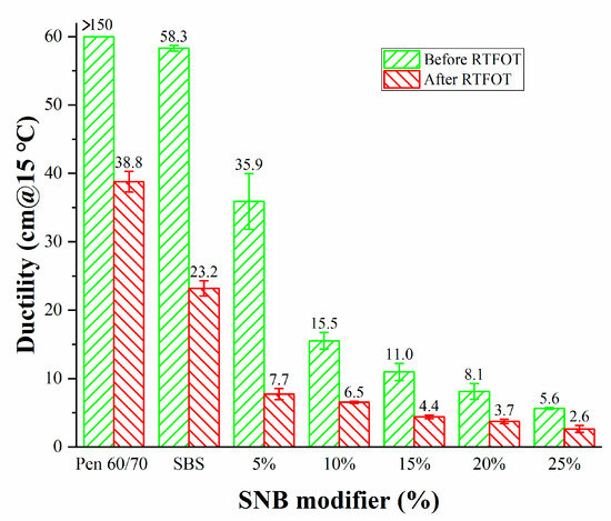 The results of the penetration (25 °C) (JTG E20 T0604-2011) [32], softening point (JTG E20 T 0606-2011) [43], and ductility (T=15 °C) (JTG E20 T 0605-2011) [44] tests are shown in Figure 3, Figure 4 and Figure 5. The addition of SNB led to lower penetration and a higher softening point. This evolution was confirmed by the measurements obtained from the ductility test which showed values below 40 cm for SNB modified material. This is considerably lower than what was observed in the case of the Pen 60/70 binder with ductility greater than 150 cm and the SBS modified binder with ductility equal to 58.3 cm. A similar trend can be observed in the case of the short-term aged samples, for which the aging resulted in harder and less ductile material compared to the unaged condition. This suggests that the presence of the SNB additive may potentially negatively affect the low-temperature performance of the binder blends both in the unaged and short-term aged conditions. The experimental results of the conventional tests support the idea that SNB can decrease the penetration, increase the softening point, and decrease the ductility of asphalt. This is consistent with the results of BRA modified asphalt [21,22,23,24].