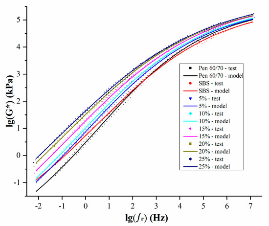The measurements obtained from the temperature–frequency sweep tests performed on the SNB modified binders were used to generate the master curve of the complex shear modulus (G*) based on the time–temperature superposition principle (TTSP) [52]. For this purpose, a reference temperature of 60 °C was selected. This is the same temperature also used during the rutting tests on asphalt mixtures (JTG E20 T0719-2011) [40]. The frequency sweep test data were fitted with a simple sigmoidal function (Equation (1)) [52] to obtain the master curve of G*: