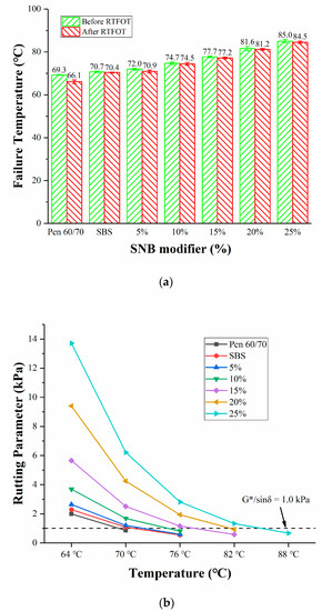 It was also noted that, with the increase in SNB content, the difference of zero shear viscosity of SNB modified asphalt became larger. For example, the zero-shear viscosity of 25 wt.% SNB modified asphalt was more than two-fold greater than that of 20 wt.% SNB modified asphalt. This means that ZSV test can distinguish the high temperature performance of modified asphalt with a high content of SNB. The experimental results of the three high temperature performance tests conducted above show that SNB can improve the high temperature performance of asphalt, which is in agreement with those of other natural modified asphalt results [17,18,21].