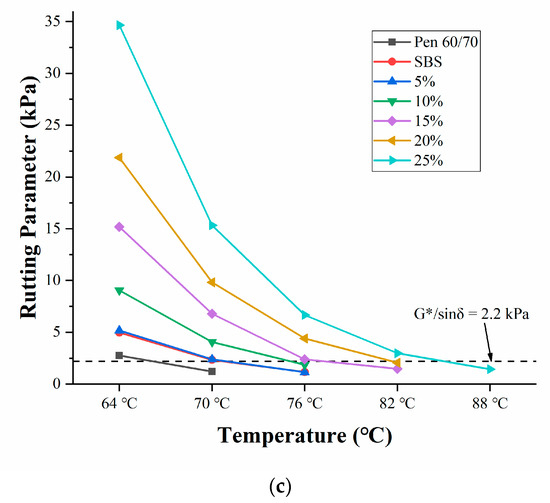 Results of Superpave rutting factor test: (a) failure temperature; (b) Superpave rutting factors for unaged samples; (c) Superpave rutting factors for RTFOT samples.