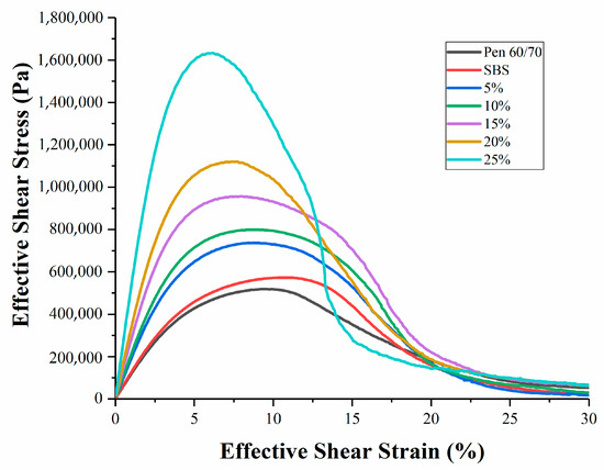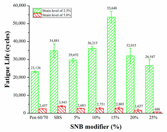 There are very few studies about the fatigue performance of natural modified asphalt. The LAS test was selected for addressing the fatigue performance of the SNB modified binders at a testing temperature of 25 °C (AASHTO TP101) [35]. According to the requirements of AASHTO TP101 (2014) [35], the value corresponding to the peak point of the stress–strain curve is regarded as the fatigue failure point. The stress–strain curves of blends are shown in Figure 10. It can be seen from the curves that the strain corresponding to the fatigue failure point decreases with the increase in SNB content. Under the same strain condition, the stress increases with the increase in SNB content before reaching the fatigue failure point. The fatigue life, represented by the number of loading cycles to failure (Nf) at the strain levels of 2.5% and 5.0%, is presented in Table 7 and Figure 11.