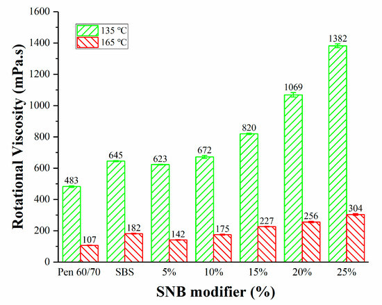 The response of the SNB modified binder at mixing temperature was evaluated with a rotational viscometer and the dynamic viscosity (JTG E20 T0625-2011) [37] at 135 °C and 165 °C was recorded for the different binder blends.