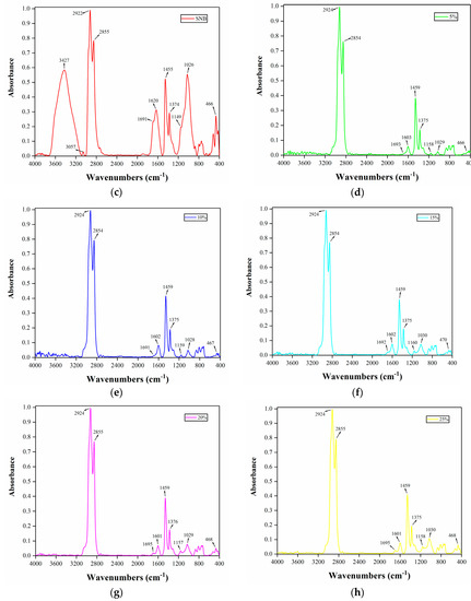 The infrared spectrum of the virgin asphalt and SNB modified asphalt was obtained by detecting the absorption of infrared rays. Fourier-transform infrared spectroscopy (FTIR) was used to obtain the chemical bonds and functional groups of SNB modifier and SNB modified binder. The sample was compressed into pellets with a thickness of about 1 mm and then placed in the instrument. Through scanning by FTIR spectrometer, the infrared spectrum range of 4000 to 400 cm−1 of the sample was obtained.