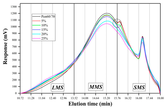 The molecular weight distribution of SNB modified asphalt was obtained by a gel permeation chromatography (GPC) test. GPC is a liquid chromatography method that uses the unique characteristics of porous gel stationary phases to separate molecules of different sizes according to the elution time. This study used tetrahydrofuran as the mobile phase; the temperatures of the columns were 35 °C, the flow rate was 1.0 mL/min, the concentration of the test solution was 2.0 mg/mL, and the injection volume was 10 μL. Table 2 summarizes the experimental program on asphalt binder for the present research. All the experiments mentioned above were carried out on three replicates.