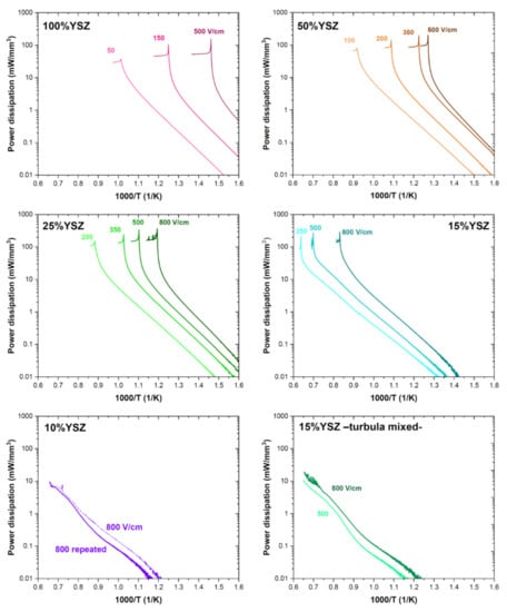 Specific power density as a function of the reciprocal of the furnace temperature for composites possessing different compositions (constant heating rate = 20 °C/min). Where not otherwise specified, the composites were produced by manually mixing YSZ and alumina powders. The sample containing 10 vol.% YSZ was tested twice under 800 V/cm to confirm the absence of the flash transition. All the plots refer to samples without thermal insulation, the current limit was 8 mA/mm2.