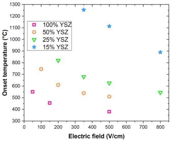 Flash onset furnace temperature as a function of the electric field and composite composition in samples produced by manually mixing the powders (constant heating rate = 20 °C/min). The samples were not thermally insulated and the current limit was 8 mA/mm2.