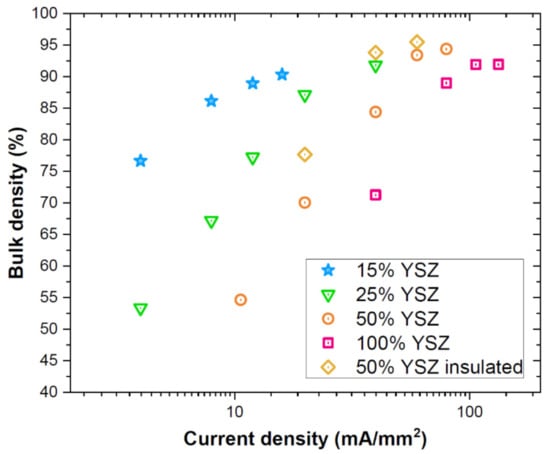 The effect of the current limit on the ceramic bodies densification is reported in Figure 3. The results refer to the experiments carried out at constant furnace temperature (1000 °C) and maintaining the power source in current limit for the entire process (120 s), thus avoiding the incubation step for FS. One can observe high density (90%) can be achieved in all tested compositions. The relative density of all composites grows with the set current limit since Joule heating increases the sample temperature. The composition-related variation of the electrical conductivity causes a substantial shift in the current density required for densification: the larger is the YSZ load, the higher are the conductivity and the current required for densification. In particular, one can observe that the composite containing 15 vol.% YSZ can be densified with current limits in the order of 101 mA/mm2, whereas pure YSZ requires currents in the order of 102 mA/mm2. It is also worth mentioning that the relative density of both the turbula-mixed samples (which did not show the non-linearity of FS in the power plots, Figure 1) was only 50–52%. These values are only slightly above the pre-sintered materials density (49–50%), confirming that no substantial densification occurred. The result agrees with the idea that the flash is a power-activated phenomenon and only modest densification takes place during the incubation stage. Hence, the field alone does not appear to be the real reason for fast densification upon FS, the process being instead related to power dissipation.
