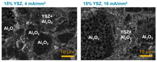 The SEM micrographs in Figure 4 confirm the current effect on densification, pointing out that a current limit increase improves densification and activates grain coarsening. One can also notice that the composites manufactured by manually mixing the powders (Figure 4) are not really homogeneous, they presenting big alumina islands within a mixed YSZ/Al2O3 matrix. The confinement of part of the insulating phase (i.e., Al2O3) within these islands decreases its load in the matrix where the electric current is supposed to flow. For such reason, it was possible to flash sinter composites containing only 15 vol.% YSZ, the real YSZ load in the percolative matrix being definitively larger than 15 vol.%. In this case, inhomogeneity helps.