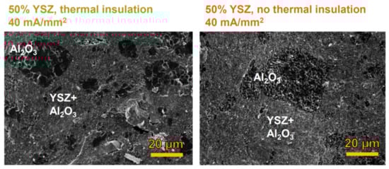 Density measurements and SEM micrographs in Figure 3 and Figure 5 reveal that the use of ceramic felts to insulate the specimen (and limit heat dissipation) accounts for a significant FS improvement. In fact, the use of thermal insulation allows to increase the relative density by about 10% in the samples treated with 22 and 40 mA/mm2 (50 vol.% of YSZ). Moreover, the microstructure appears coarser because of the heat concentration within the sample. This is really evident in the alumina islands, where the grain size exploded when employing thermal insulation. This further confirms the predominant thermal nature of the mass transport phenomena in the alumina pockets.