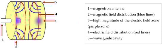 The focal point of the wave guide is located in the center of the wave guide at 6 cm (half-wavelength) from the magnetron antenna []. The electric field amplitude in this focal point has a very high magnitude, while the dimension of the focal volume is estimated to be around .