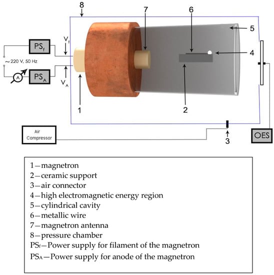 To study the behavior of metallic wires in interaction with the microwaves we exposed them to a high-power microwave field. Using a commercially available magnetron (frequency (f) = 2.45 GHz, microwave power = 800 W, (Whicepart Electronic LTD, model 2M2013-01TAG, Zhejiang, China)) coupled with a waveguide cavity we obtained a high power of microwaves in the node zone inside of the waveguide. The metallic wires were placed in this zone and then irradiated with microwaves. The single-mode waveguide was constructed in accordance with TM011 propagation mode (transverse magnetic mode) [], its dimensions being 10.5 cm diameter and 11 cm length; the microwaves entering this waveguide were focused in a single point corresponding to the node of the electromagnetic field (Figure 1).
