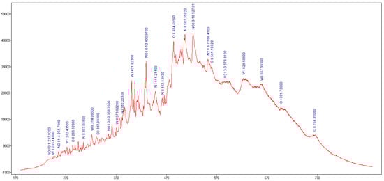 To identify the excited neutral atoms species (nitrogen (NI), oxygen (OI), tungsten (WI)) and the ions species (nitrogen (NII), oxygen (OII), tungsten (WII)) [] from plasma we used the OES method. In Figure 4 the emission spectrum of the plasma at atmospheric pressure recorded from the 0.5 mm W wire plasma is displayed.