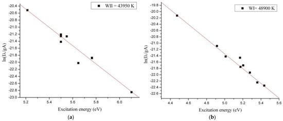 Boltzmann Plot for (a) WI in the air at normal pressure and (b) for WII in air at normal pressure.