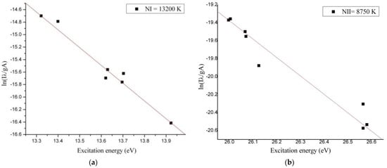 Boltzmann Plot for (a) NI in the air at normal pressure and (b) for NII in air at normal pressure.
