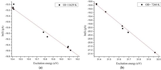 The Boltzmann Plot for (a) OI in the air at normal pressure and (b) for OII in air at normal pressure. I: intensity of spectral lines, wavelength of spectral lines, A: transition probability, g: the statistical weight of upper energy level, Excitation energy (eV): energy level of the upper state.