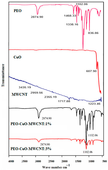 The FTIR spectra of the polymer matrix, i.e., PEO, fillers (CuO and MWCNTs) and the composite nanofibers, are shown in Figure 2. The FTIR spectrum of pure PEO shows a strong peak at 2874.90 cm−1, which is related to asymmetric C-H stretching vibrations of CH2 groups. The significant central peak at 1468.33 cm−1 is due to asymmetric bending vibrations of CH2 groups, while a strong intense peak at 1102.06 cm−1 is attributed to the asymmetric C–O–C stretching for epoxide groups. These configurations are in agreement with the structural features of PEO polymer [39]. The FTIR spectrum of CuO nanoparticles is shown in (Figure 2), presenting a major peak at 607.90 cm−1 [40]. The spectrum of MWCNTs shows two strong bands at 3435 and 1717 cm−1, representing the O–H and C=O of carboxylic acids, respectively [37], this indicates the successful oxidation of MWCNTs.