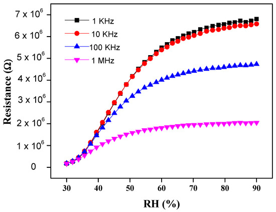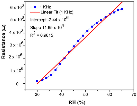 The remarkable increase of resistivity response was measured over a % RH range from 30 to 90% at four different frequencies, i.e., 1 KHz, 10 KHz, 100 KHz and 1 MHz, respectively. It was observed that the resistance at lower frequencies (1 KHz and 10 KHz) enhances proportionally to RH. This resistance change of the sensor is displayed in Figure 3. The data show that at 30% RH, the resistivity shown by 1% wt nanocomposite is about 1.5 × 105 Ω, which is smaller than 6.7 × 106 Ω at 90% RH at 1 KHz frequency [46]. At low frequencies, the PEO–MWCNT–CuO: 1%-based sensor exhibited the highest resistivity sensitivity of ~3798.2%, as displayed in Figure 4, with a slightly low correlation in resistance (R2) as compared to PEO–MWCNT–CuO: 3% nanocomposite-based sensor, as shown in Figure 5.