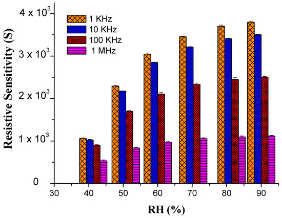 It has been shown that frequency has a major role and impact on the humidity sensing performance. The results of humidity sensing efficiency of the composite nanofibers are investigated at various input frequencies such as 1 KHz, 10 kHz, 100 KHz and 1 MHz. Figure 3, Figure 4, Figure 5, Figure 6, Figure 7 and Figure 8 indicate the resistivity and capacitance response, of PEO–CuO–MWCNT: 1% and PEO–CuO–MWCNT: 3% composite nanofibers upon % RH, ranging from 30–90%. When RH increases, the capacitance and resistance of nanocomposites also increase along with the frequency. Conversely, it is observed that at low frequencies, the sensor shows high capacitive and resistive response, as compared to high frequency [44]. The following equation is used to determine the sensitivity of the sensor: