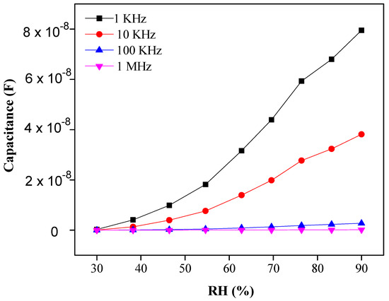 The capacitance response of PEO–CuO–MWCNT: 3% nanocomposites drastically increased from 1.09 × 10−10 F (for 30% RH) to 7.9 × 10−8 F (for 90% RH) as shown in Figure 6, while a frequency shift can be observed from 1 KHz to 1 MHz [47]. The high capacitance response of PEO–CuO–MWCNT: 3% composite nanofibers can be ascribed to the formation of multilayers of water on the exterior of the sensor that increases the dielectric constant, leading to an abrupt capacitance change [48]. However, the ideal situation for a sensing material is revealed when the humidity is low, and thus less water is absorbed. Subsequently, leak conduction occurs by absorbing water molecules. The capacitance C of the sensing material with leak conduction can be illustrated by the following equation: