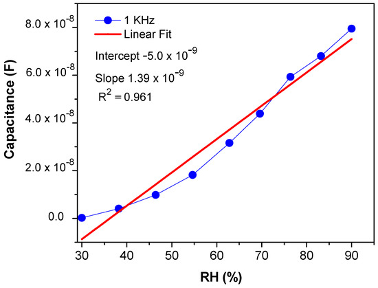 From Equation (3), it can be concluded that the capacitance of the sensing material is directly proportional to γ and inversely proportional to frequency [49]. Moreover, Figure 7 shows the sensor exhibited high capacitive sensitivity of ~53,837.6% at lower frequencies such as 1 KHz at 90% RH [50] than ~3784.81% resistivity sensitivity. Though the sensor shows a high sensitivity within the RH range of 30–70%, the response or sensitivity in the RH range of 70–90% RH is also considerable. PEO–CuO–MWCN: 3% nanocomposite showed improved linear regression coefficient (R2) with a positive slop over wide humidity range levels such as 30–90% RH as displayed in Figure 8.