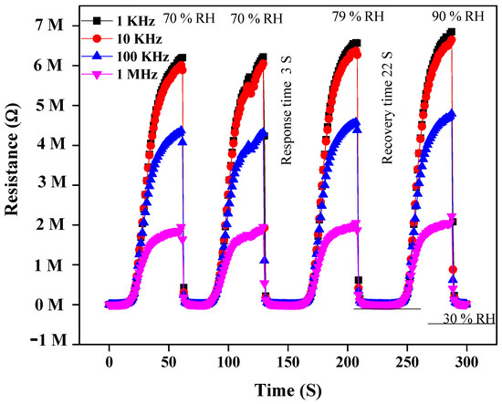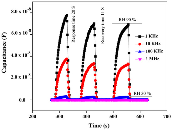 Owing to their low density and high aspect ratio, carbon nanotubes have proven to be ideal fillers for designing diverse polymer composites with enhanced mechanical performance, high electrical conductance and multi-functional properties [51]. Additionally, the oxyfunctionalities incorporated during the oxidation of MWCNTs may provide more active sites for the interaction of water molecules. Likewise, CuO is assumed to enhance the interfacial characteristics and porosity of the polymeric matrix, enabling it to efficiently absorb the water molecules [52]. Since PEO is a hydrophilic polymer, the incorporation of CuO nanoparticles and MWCNTs into it results in nanocomposites that exhibit a fast response. CuO nanoparticles and MWCNTs provide large surface-active sites for the adsorption of moisture [53]. This adsorption occurs due to the functional groups of MWCNTs and PEO, through hydrogen bonds formation or through weak physical forces with the adsorption site in the large surface area of nanocomposites [54]. However, the hydrophilic nature of the composites delays the water release; therefore, recovery time was longer at 22 s and 11 s. At high frequencies (1 MHz or 100 KHz), the response and recovery time is much lower for the capacitance humidity sensor, than the resistivity humidity sensor, as depicted in Figure 9 and Figure 10.