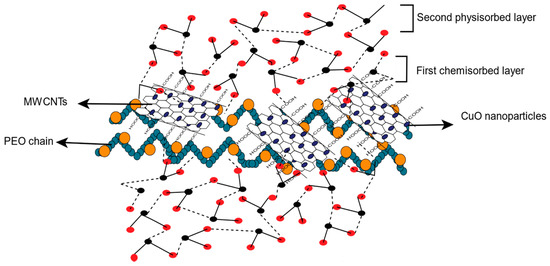 Schematic presentation of adsorption of H2O molecules on the surface of PEO−MWCNT−CuO nanocomposites.