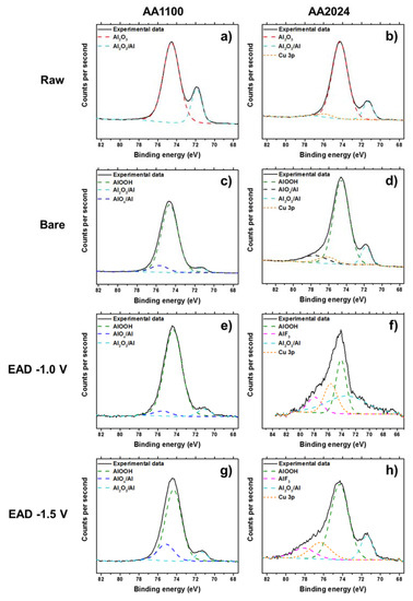 XPS high-resolution spectra of Al 2p region, before (Raw, a,b) and after alkaline etching process (Bare, c,d), and after electro-assisted deposition of ZrO2, generated at −1.0 V (e,f) and −1.5 V (g,h). Left: AA1100 samples and right: AA2024 samples.