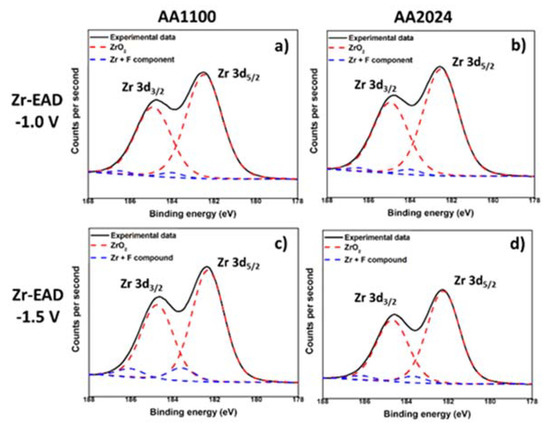 Taking into account the deconvolution of Zr high resolution spectrum, with two peaks of Zr 3d5/2 and Zr 3d3/2 at binding energies of 182.5 eV and 185 eV (Figure 4), respectively, the inorganic coating is mainly composed by zirconium oxide, whereas some minor residual fluorine complexes are probably present [17,25,42]. Fluorine element observed in EAD samples (Figure S3) most arises from the bath, whereas that detected in Raw and Bare substrates comes from some equipment contamination. Zhang et al. [10] have reported that conversion coatings of 5052 aluminum alloy (Mg-rich alloy) obtained from fluorine salt solutions contains hydrated AlF3 compound trapped among the metal oxides. As the contribution of fluorine has been measured to be between 2–3%, and even less for Raw and Bare substrates, it has been considered to not interfere significantly in the interpretation of the results regarding the main components. The EAD coating composition found was consistent with that reported for DC method [25,35,42]. In AA1100 samples, the Al-rich and Zr-rich zones pointed out in Figure 2e, are not differentiated. The apparent atomic ratio of Al/Zr is close to unit (0.91 and 1.41, for EAD −1.0 V and EAD −1.5 V, respectively); whereas in AA2024 such values have been reduced to a factor of 1/3 and 1/2 (Table S2). Based on XPS evidences, undoubtedly, the unique explanation for the high content of Zr atoms in AA2024 is the distribution of ZrO2 molecules over the abovementioned surface, i.e., the homogeneity of the film covering the substrate, which seems to be favored by both, the use of the EAD technique and the presence of Cu-rich sites.