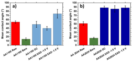 Wettability of (a) AA1100 and (b) AA2024 substrates before and after the application of the following treatments: Raw (metal plates cleaned with acetone); Bare (metal plates degreased with Saloclean 667N and grinded); DC (dip-coating method); and EAD (electro-assisted deposition at two different potentials).