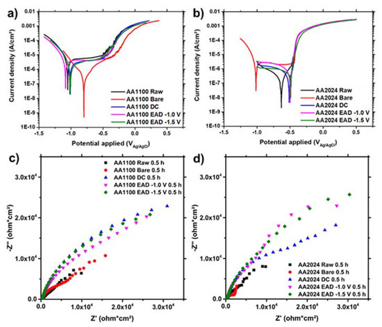 (a,b) Polarization curves and (c,d) Nyquist plots of AA1100 (a,c) and AA2024 (b,d) specimens after 30 min of immersion in aqueous NaCl 0.05 M electrolyte.