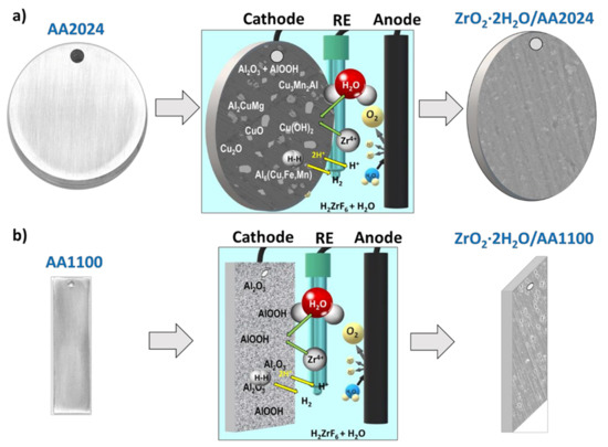 Illustration of the best conditions for Zr-EAD deposition on: (a) AA2024 disks and (b) AA1100 aluminum plates. From left to right: Bare substrates; application of −1.0 V of cathodic potential and 4 min of electrochemical reaction; Zr-EAD coated specimen. Arbitrary scale has been used for the visual representation of the reactions.